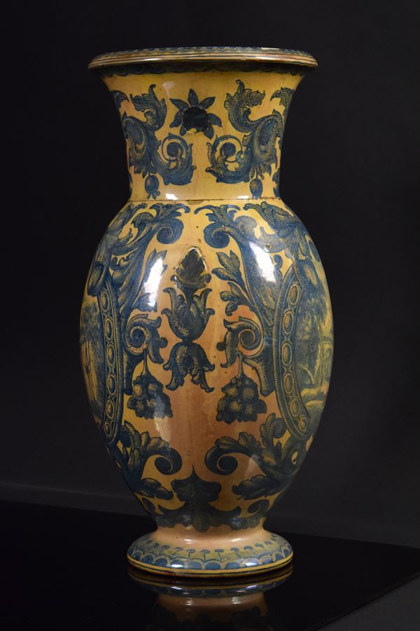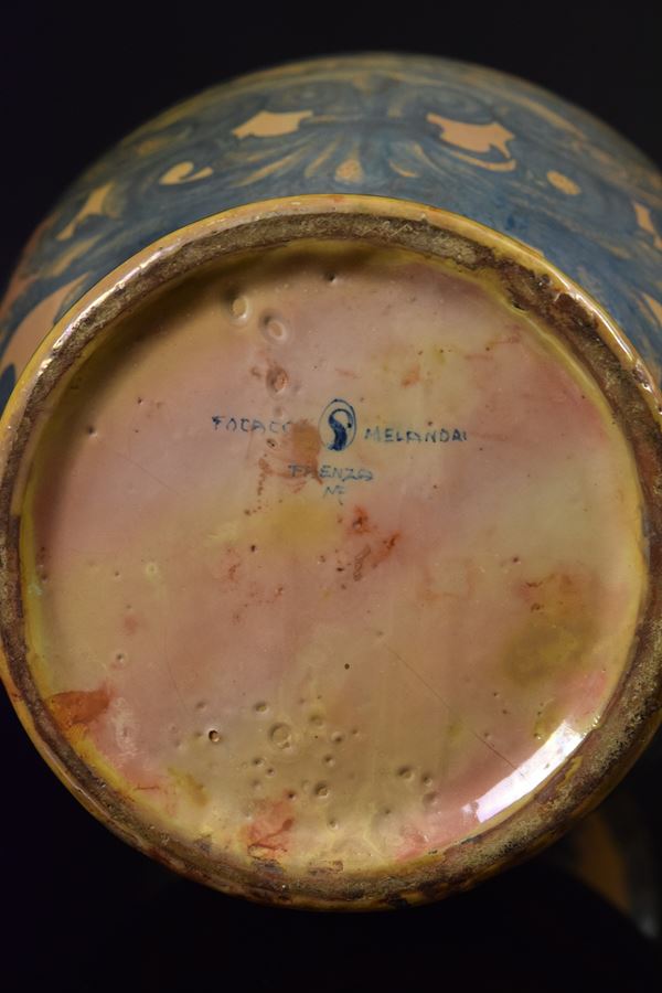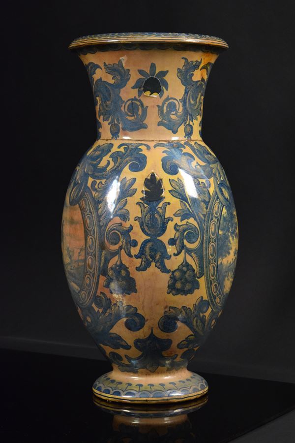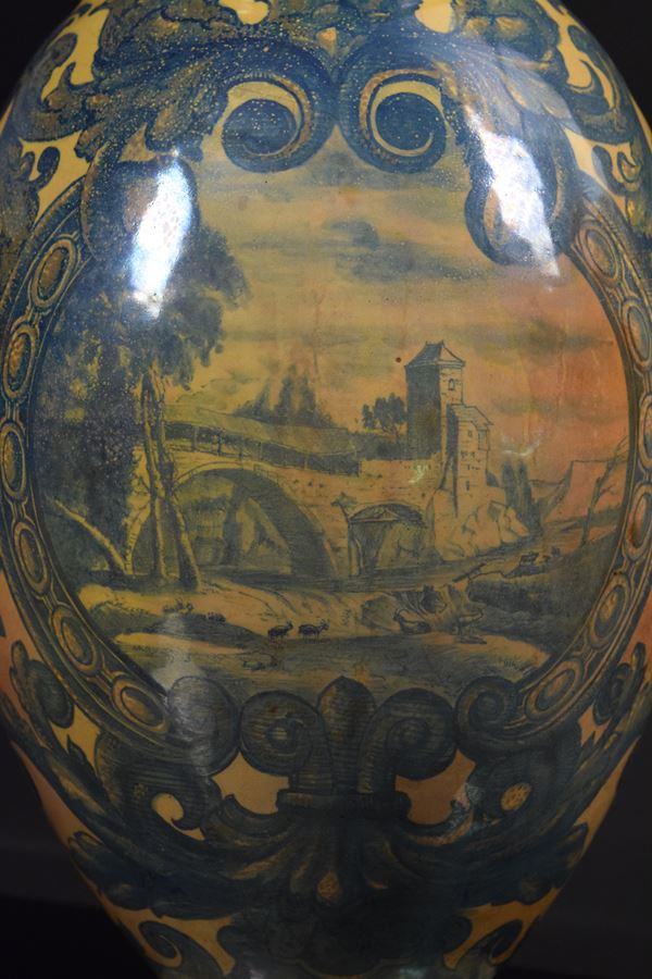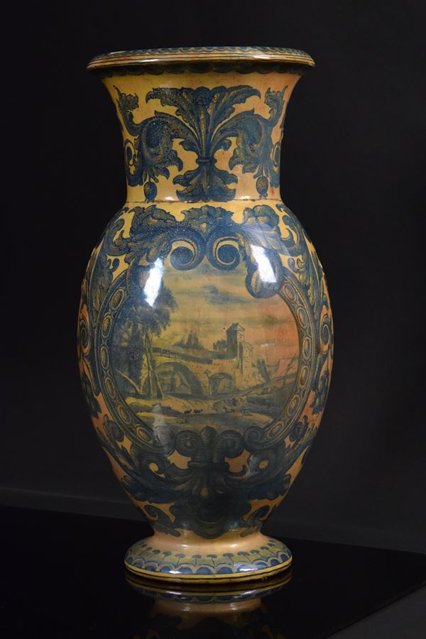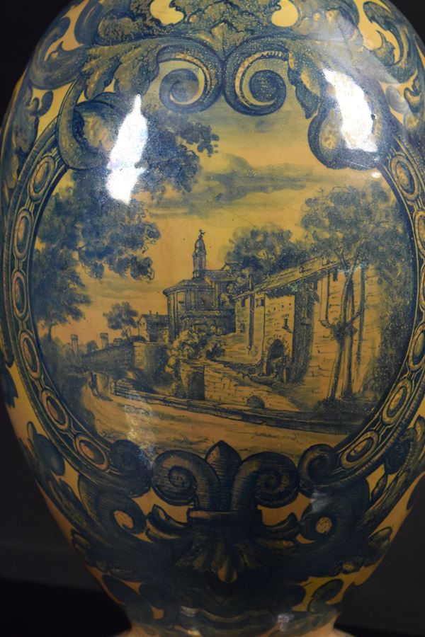 Grande vaso in ceramica policroma riflessato all'acido, decorato a motivi vegetali che incorniciano nel fronte e nel retro paesaggi faentini ottocenteschi.