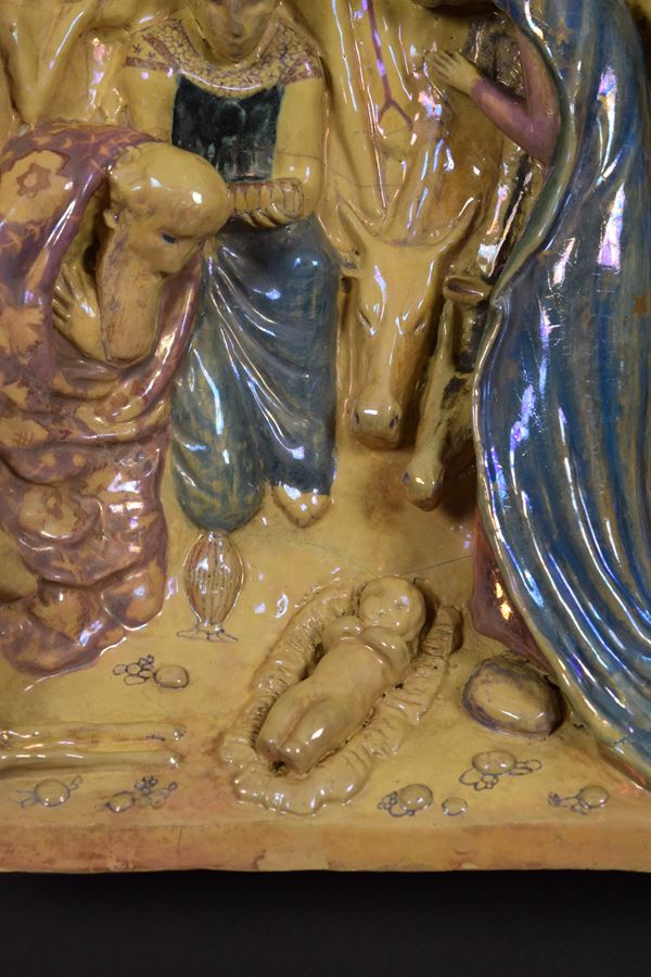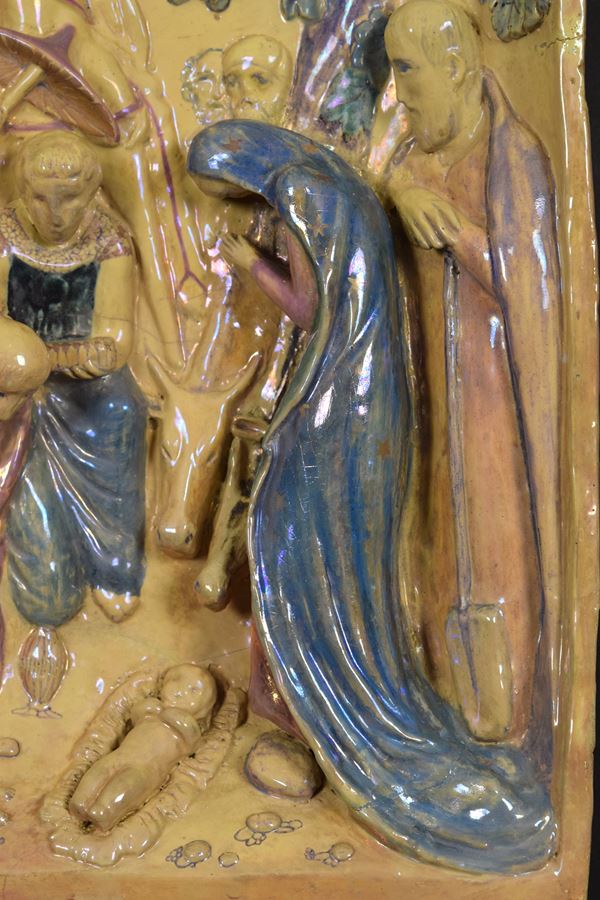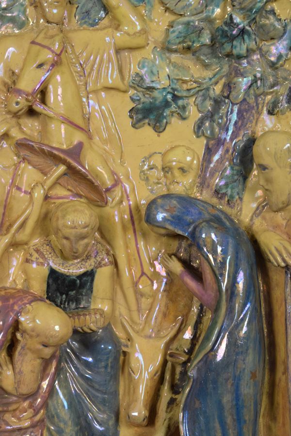 Importante e rara formella centinata in rilievo in ceramica policroma riflessata raffigurante l'adorazione dei Magi.