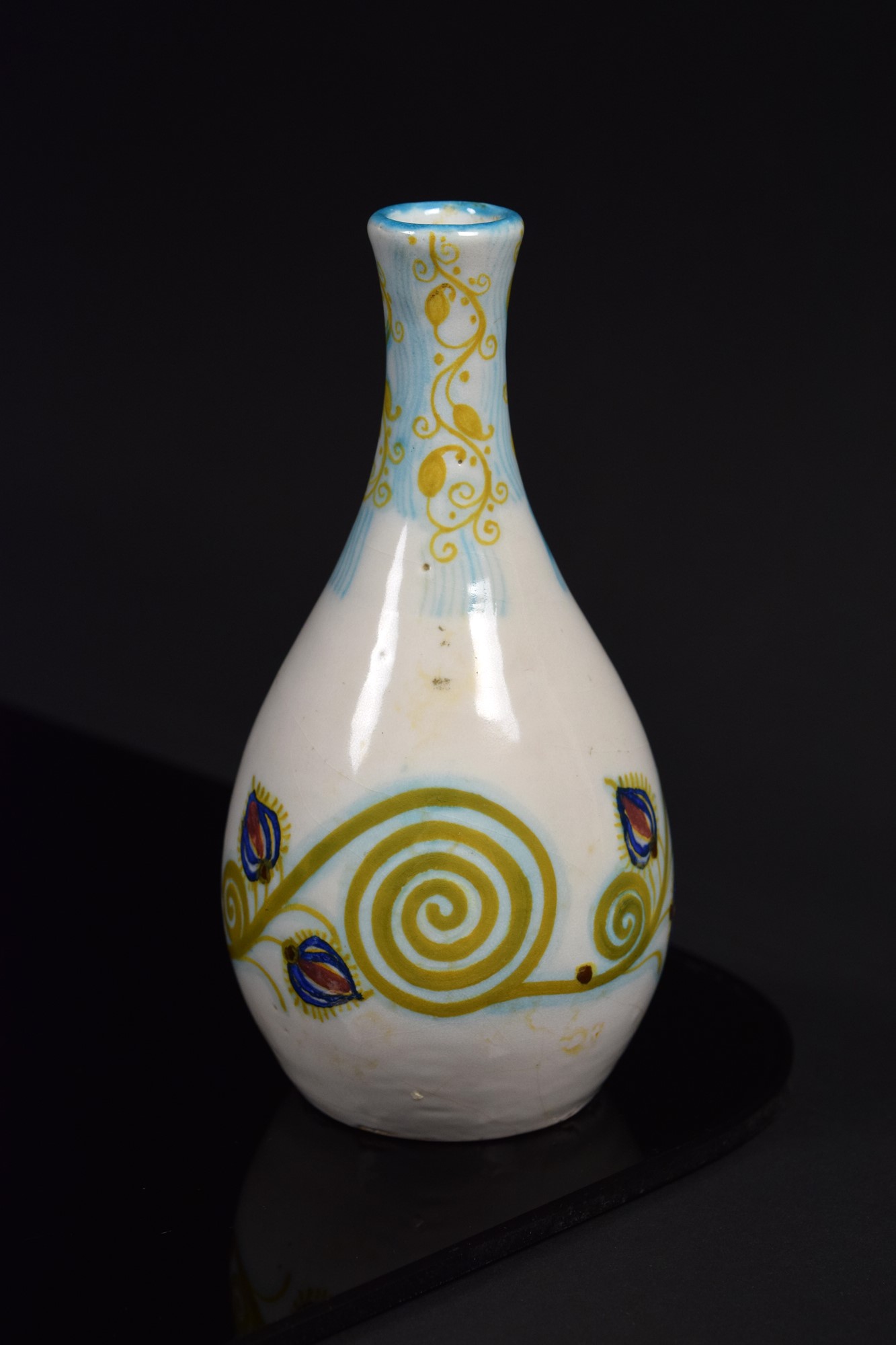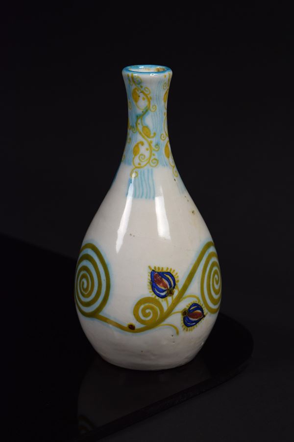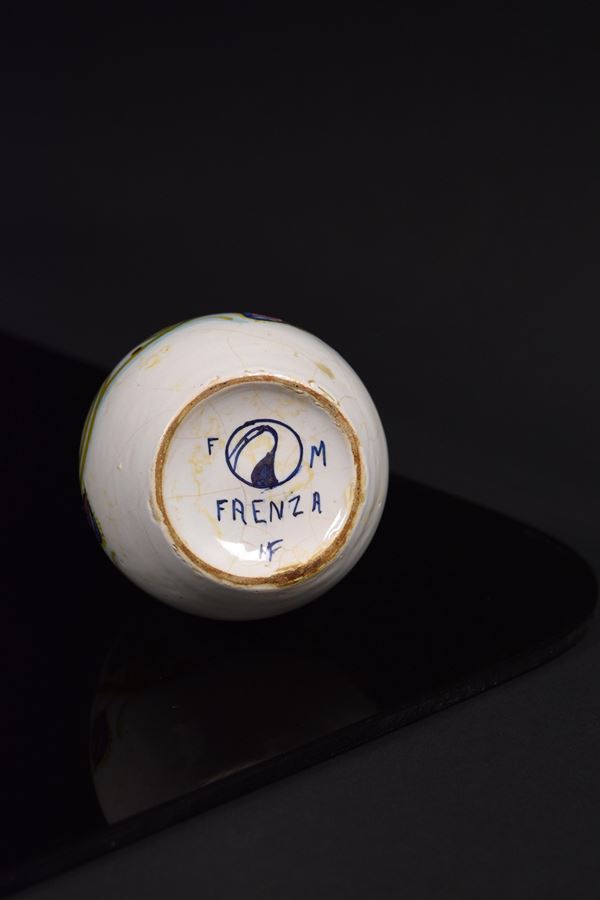 Piccolo vaso in ceramica policroma con decori vegetali.