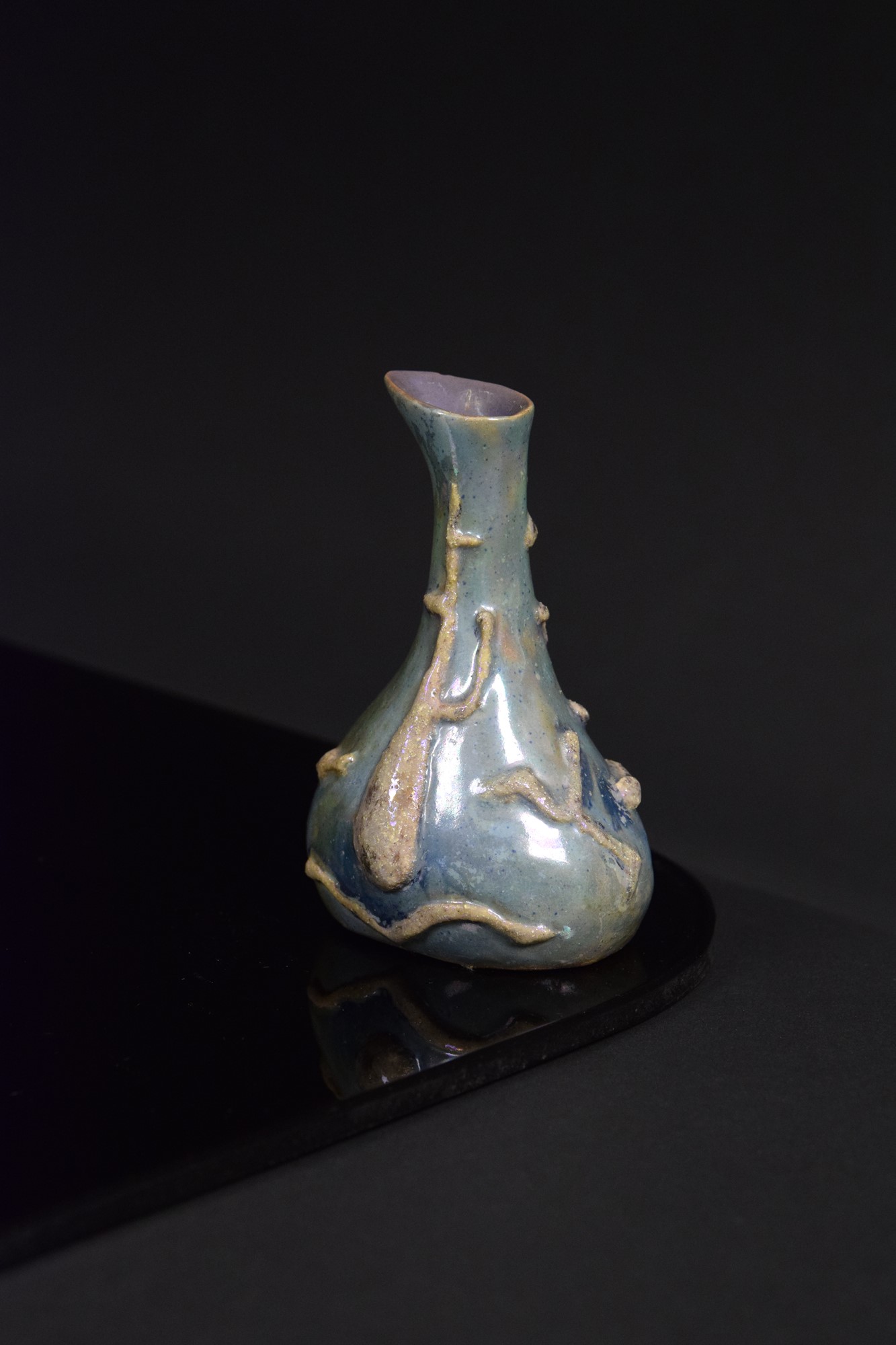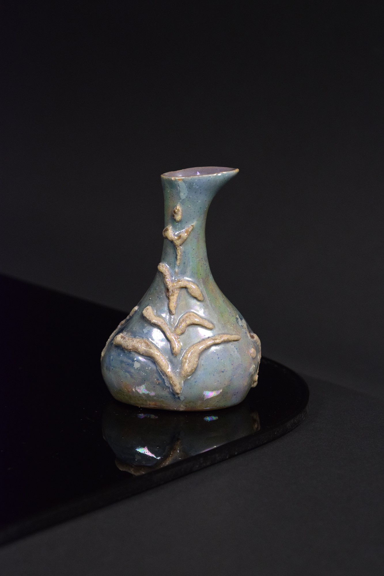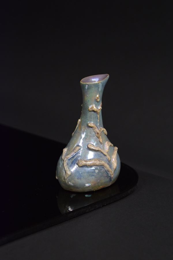 Piccolo vaso in ceramica policroma rilessato a lustro con decori a rilievo.