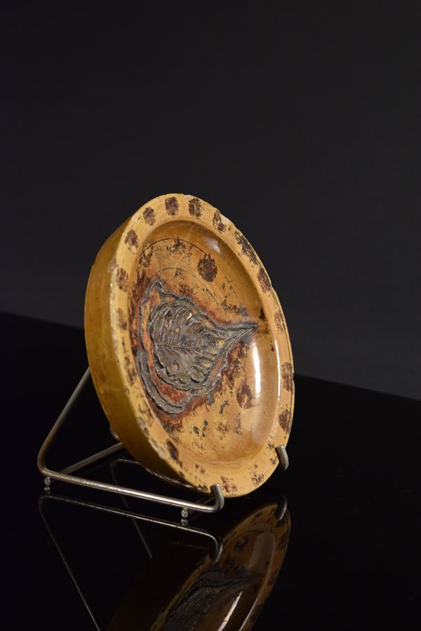 Piccolo tondello in ceramica policroma a bordo rialzato nei toni del bruno, al centro foglia stilizzata.