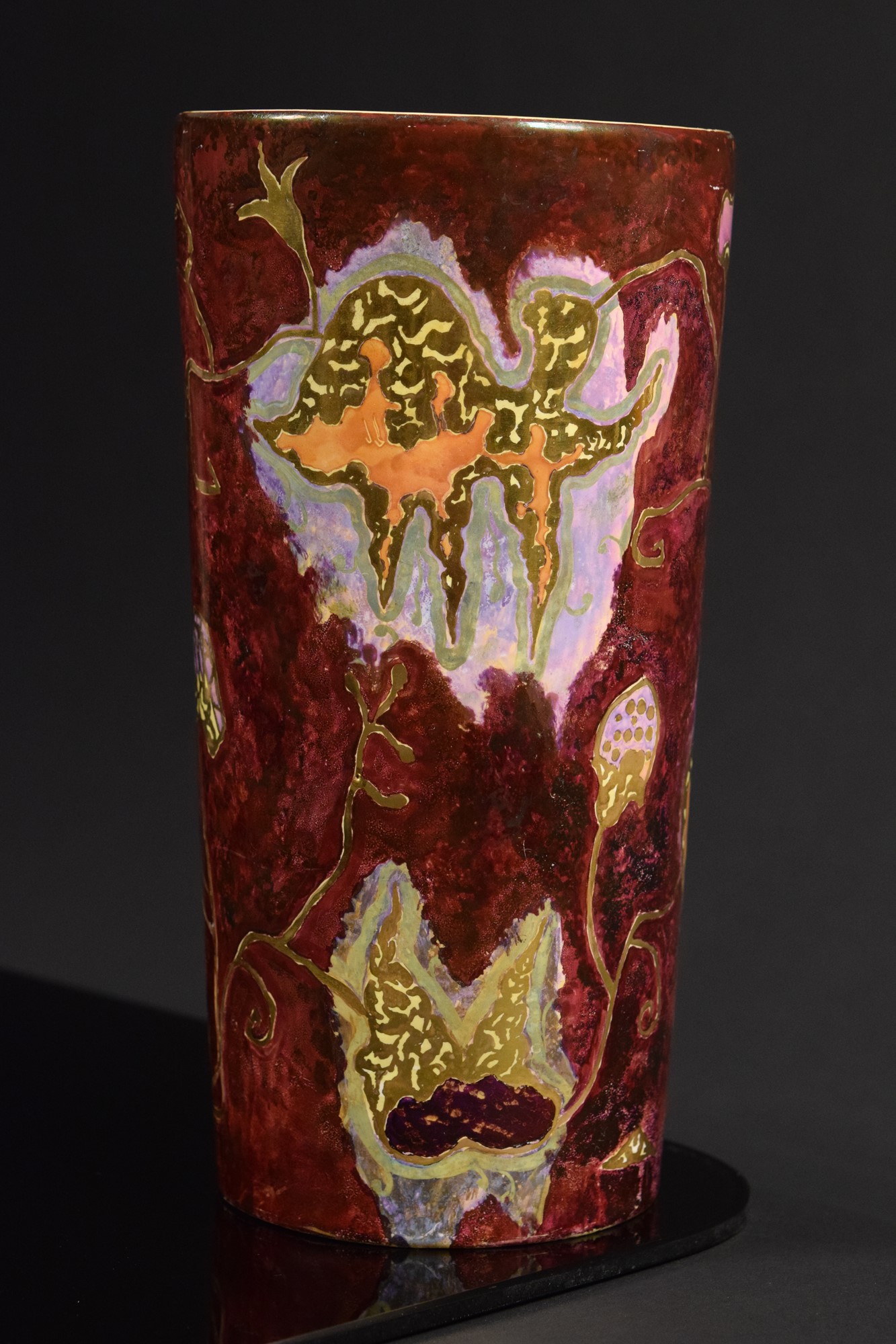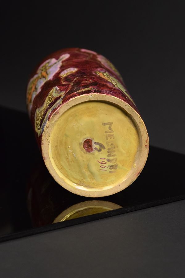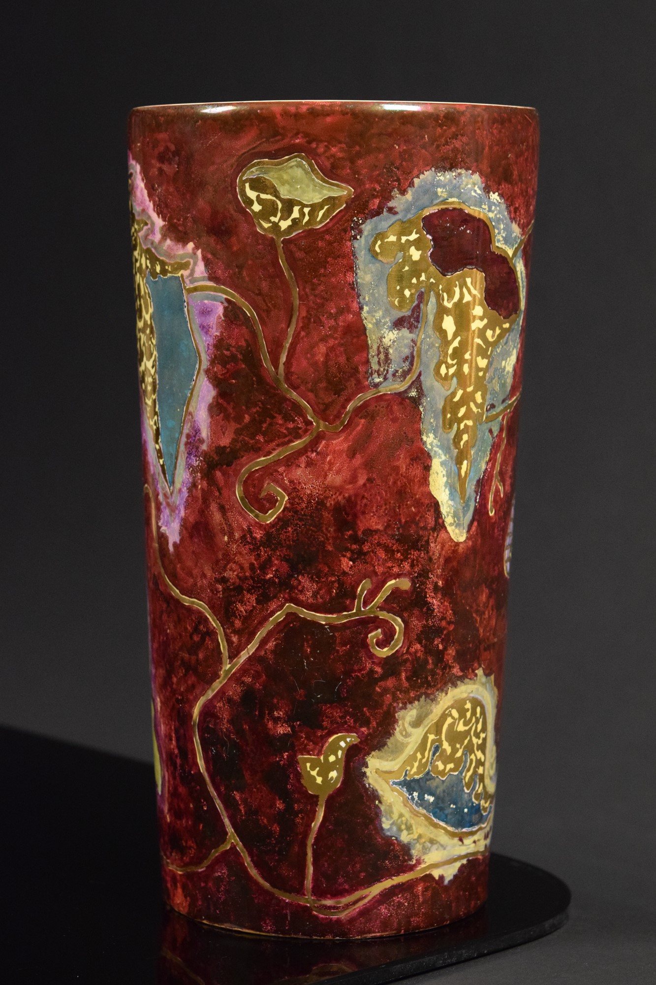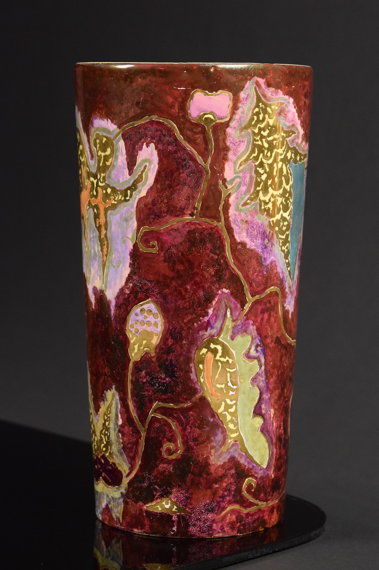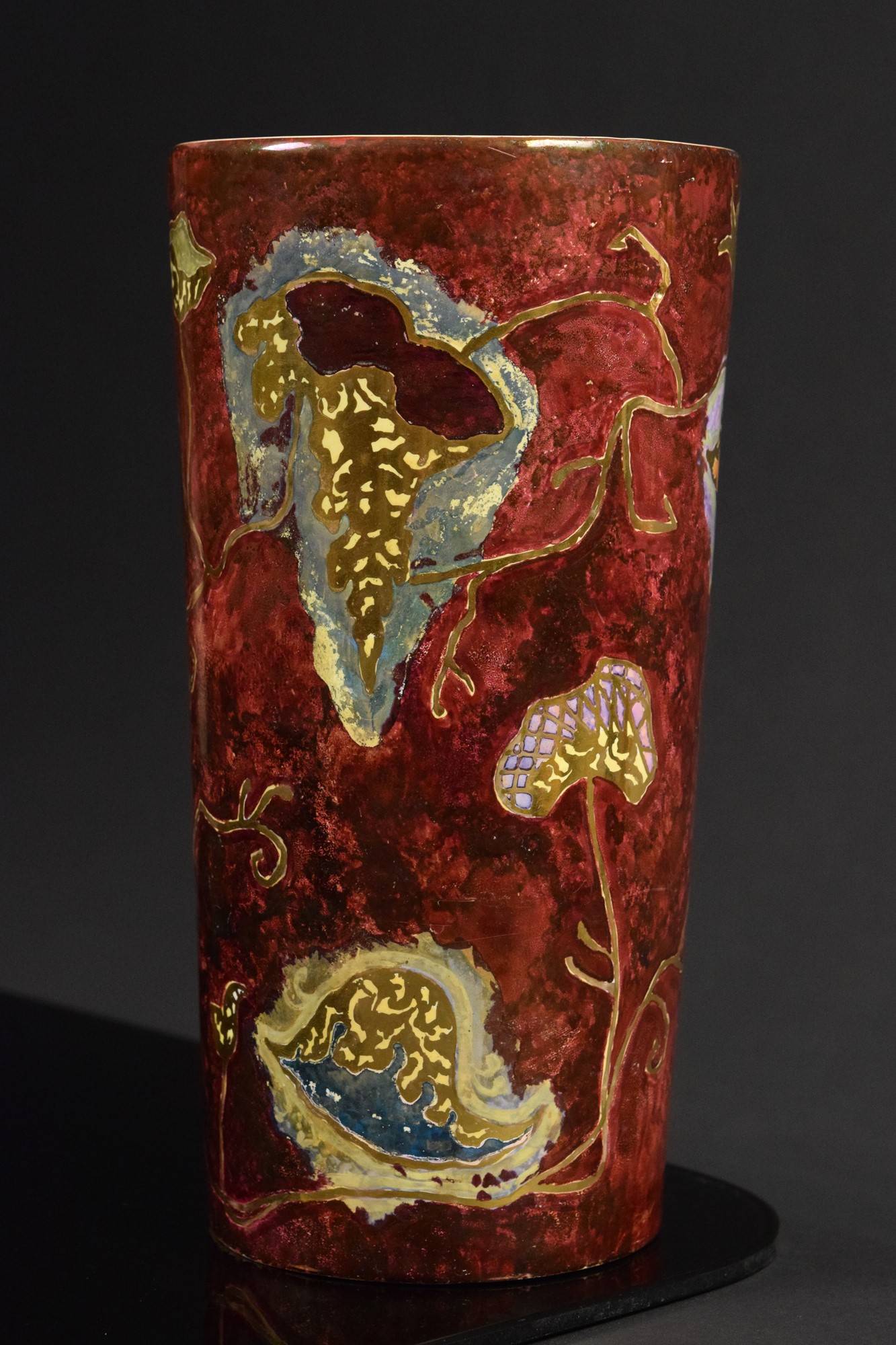 Vaso cilindrico in ceramica policroma a fondo rosso decorato con motivi astratti e lumeggiature in oro.
