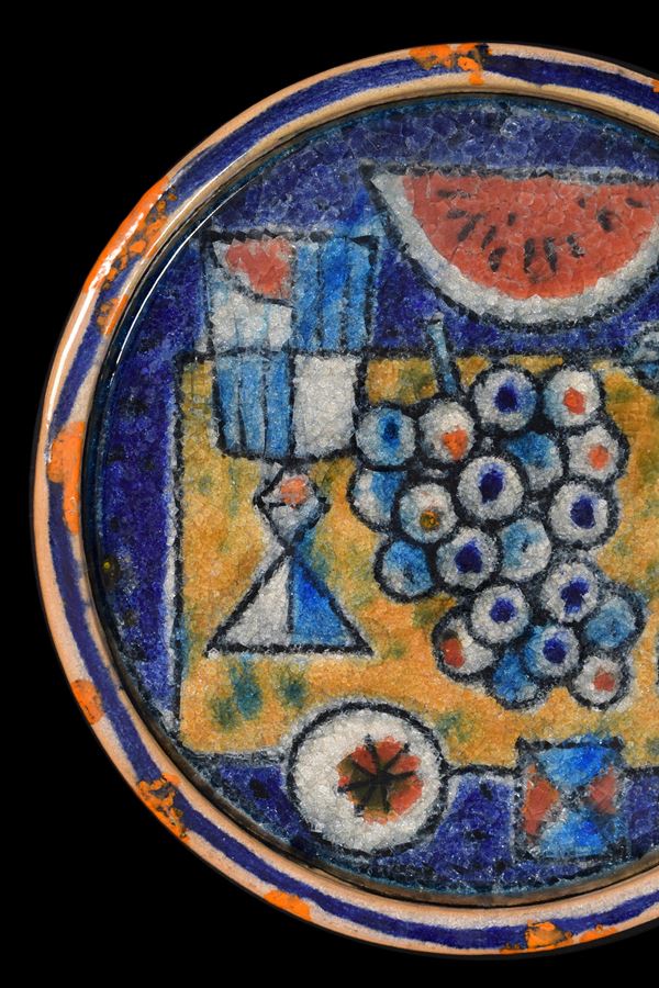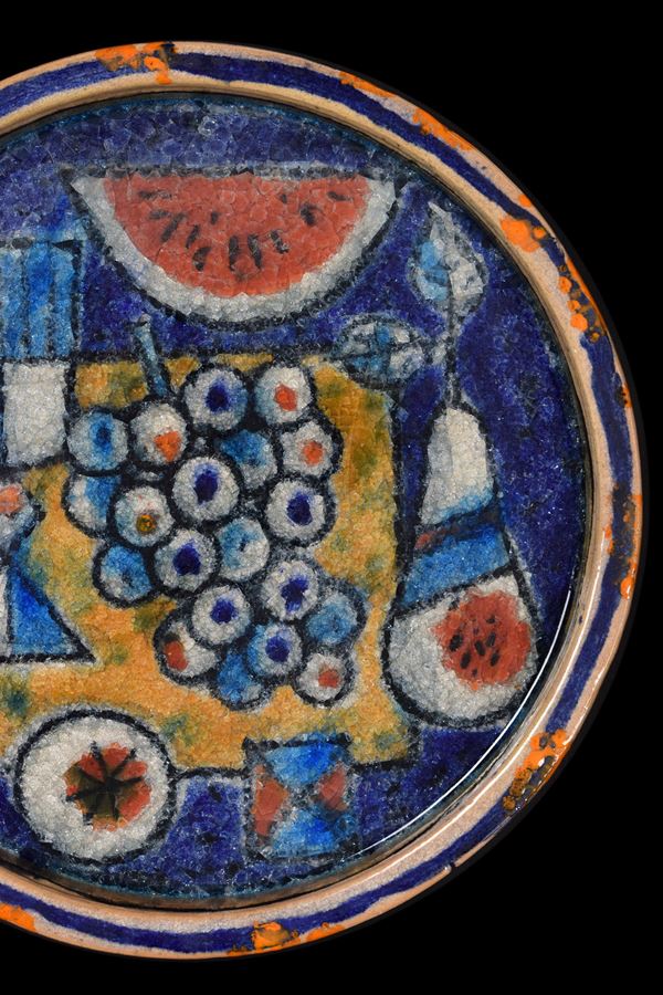 Piatto in ceramica con cristallina a grosso spessore di natura morta con uva e cocomero.