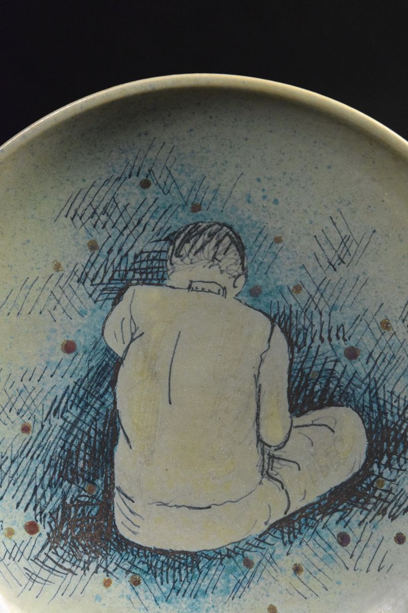 Piatto in ceramica policroma con dipinto figura di bambino seduto di spalle.