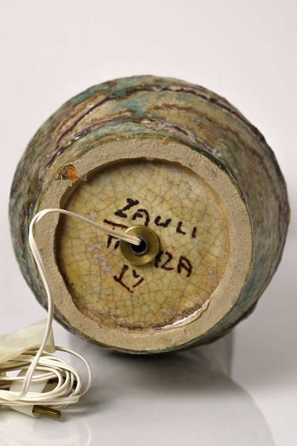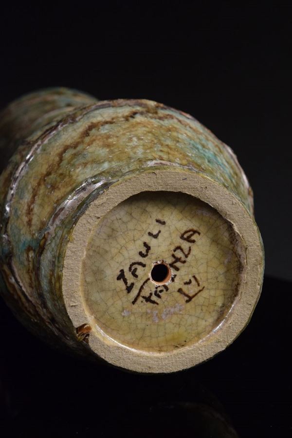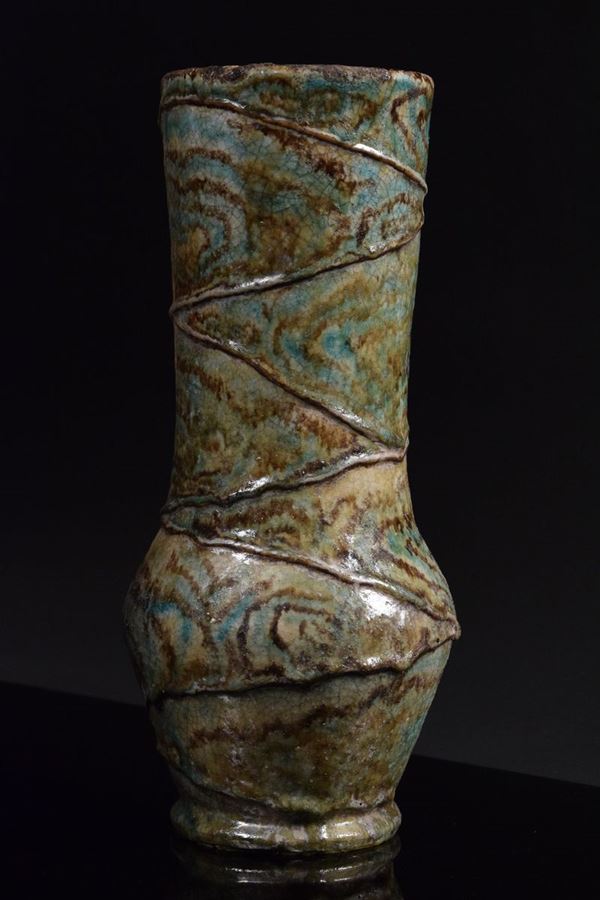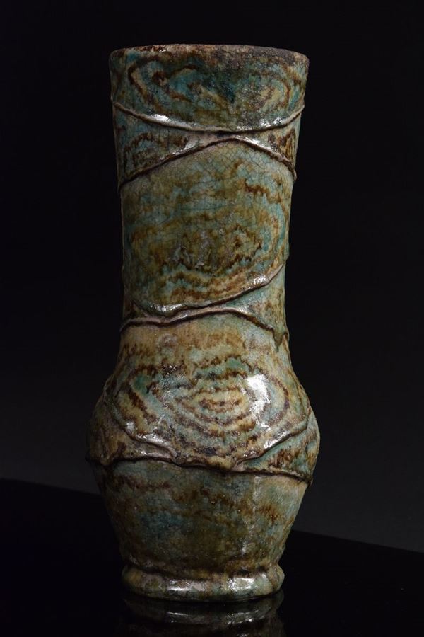 Vaso in grés policromo a motivi informali ad altorilievo e dipinti.