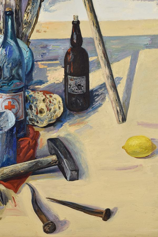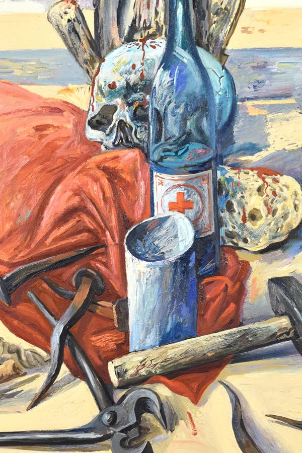 Olio su tela raffigurante i simboli della crocifissione e del dolore. Cornice coeva.