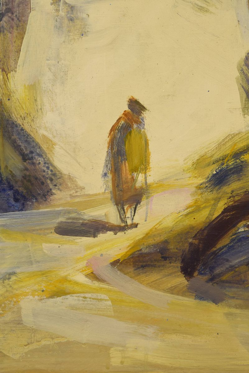 Olio su faesite di paesaggio spagnolo con figura. Cornice coeva.