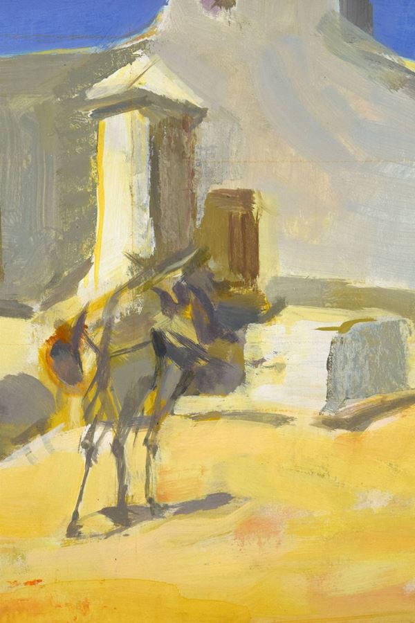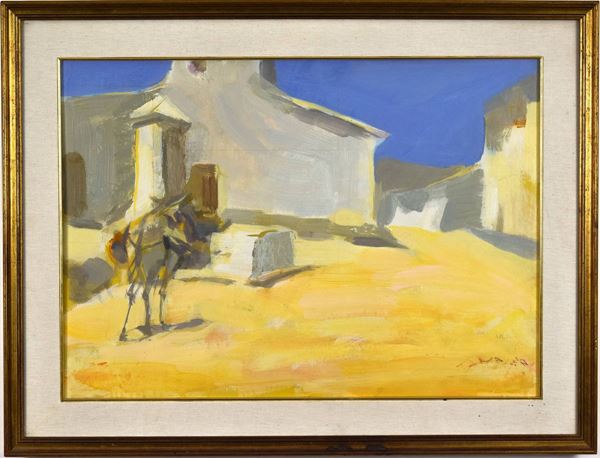 Olio su legno di paesaggio spagnolo assolato a colori accesi con mulo sulla sinistra in primo piano e dietro case e chiesa.