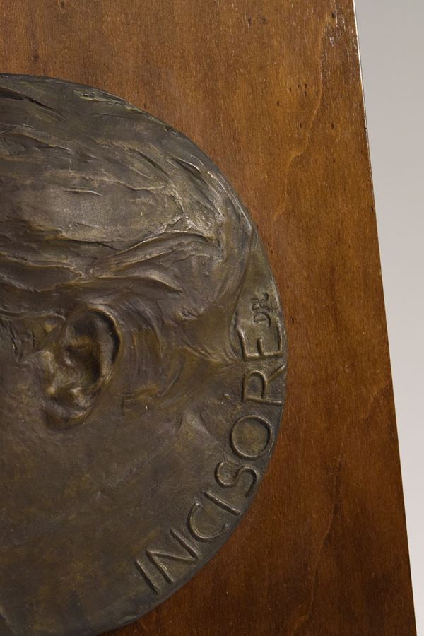 Tondo in bronzo raffigurante profilo dell'artista Francesco Nonni, attorniato dalla scritta "Francesco Nonni Incisore". Montato su pannello in legno.